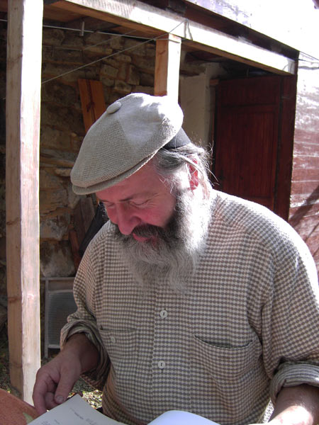 Er kann wirklich keiner Fliege ein Haupthaar krümmen. Weil sie keins hat. Aufgewachsen in einer großen Familie mit fast 10 Geschwistern, in einer Christensekte unter DDR-Verhältnissen erzogen, verweigerte er den Militärdienst und bekam daher sein Abiturzeugnis nicht und wurde dazu auch noch für ein Jahr inhaftiert. Er lebte auf diesem Berg in einer Hütte, aus der ein Baum durchs Dach wuchs (der gelernte Maurer ermöglichte durch geschickte Handgriffe das Weiterwachsen des Baumes), wohnte für einige Jahre in der Nähe von London, bis er zurückkehrte und sich auf der Anhöhe seines inzwischen zugewachsenes Weinberges sozusagen im Blickschutz der Behörden ein Häuschen baute - ohne Baugenehmigung. Einer der anliegenden Baumärkte war gerade beim Schließen, da huckte Pfanneck mit einem Leiterwagen das verschenkte Baumaterial auf die Höhe und mauerte. Ohnen einen Pfennig zu investieren. Es war der Sommer, als er so klamm war, daß er zwei Monate lang nur die Äpfel seiner Bäume aß und 15 Kilo abnahm.