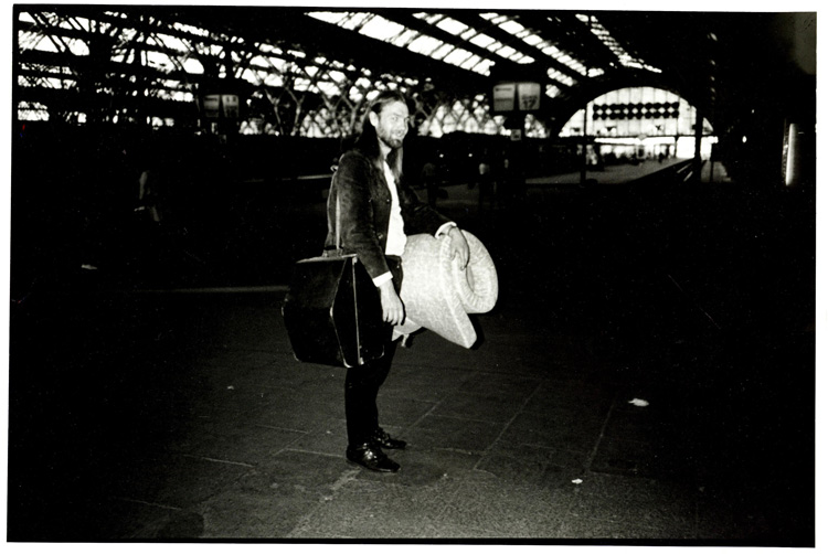 Zwei Jahre vor der Wende hatte ich mir einen Probenraum „erobert“ - im Turm, wo einst Lutz wohnte (der war ausgereist) und wo wir unsere Poeten-Boheme hatten. Von meiner Wohnung in der Keilstraße 4 bis dahin waren es 15 Fußminuten und der kürzeste Weg ging durch den Hauptbahnhof. Dort traf ich regelmäßig Leute, die unterwegs waren. Erwin Stache, Organist in einer Dorfkirche, kam öfter mit der S-Bahn und lief mir über den Weg und zeigte selbstgebastelte Klangmaschinen, Edith Tar lauerte mit ihren Fotoapparaten überall – auch auf dem Bahnhof. Wahrscheinlich wollte ich die Nacht im Probenraum bleiben und kam mit Matratze und Akkordeon an.