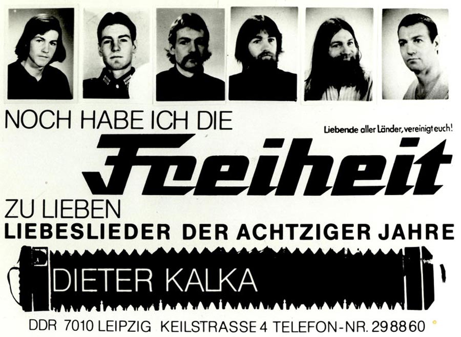 Ich sollte noch mehr Glück haben. Wer mir die Adresse in der Brockhausstraße gab, weiß ich nicht mehr. Das war die Edel-Druckerei in Leipzig und sie machten eigentlich nur die Andrucke von Fotobänden. Also mal zehn Stück, aber höchstens. Die Kleinst-Auflage (die gar nicht so klein war) von 400 Plakaten, dazu Werbekarten, Postkarten und Kassettencover (das hatte ich nebenbei auf dem Druckgenehmigungsantrag erwähnt) machten sie für mich in einer 1-A-Qualität und wenn es in der ganzen DDR kein richtiges Schwarz gab, mein Schriftzug "Freiheit" war schwarz wie der Essenkehrer. Und wer ganz genau hinschaut, das zweite Bildchen ist ausm Wehrpaß rausgerissen und oben sieht man das, weil der Wehrstempel das Foto eingerissen hat. Aber der Drucker, genau und fleißig wie ein deutscher Handwerker, retuschierte es.