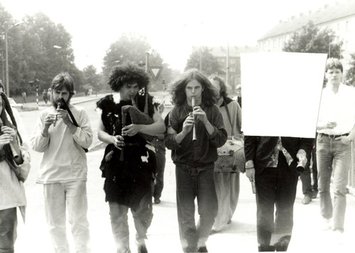 In Bachs Wohnung traf sich die Band und probte. Das heißt, irgendwann begann einer zu spielen, die anderen setzten, je nach Reaktionsvermögen ein und so kamen sie auch zum Schluß. Derjenige, der zuletzt merkte, daß nicht mehr gespielt wurde, hörte, abprupt in der Phrase abbrechend, auf. Das war so in etwa das Gegenteil von dem, was uns Bernreuther mit seiner „Kunst der Wiederholung“ eingebläut hatte. Jede halbverschluckte Vorsilbe, jede nicht genügend ausgehaltene Endung wurde gerügt.
