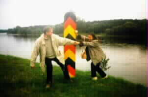 A: Eines Abends hing ein Transparent dort: „Nie wieder Faschismus". Am nächsten Tag waren die Straßen gesperrt, es erschien eine Armee Polizisten und unter dem Denkmal fand eine Massenversammlung von Nazis statt. Wie viele andere Leute, die in der Gegend wohnten, gingen wir es uns ansehen... Mit dabei waren auch Edith und Christian, unsere Freunde. Edith ist Fotografin. Wagemutig trat sie in die Rotte der Glatzen, um ein paar Bilder zu schießen. Sie kehrte zurück, bleich und grün wie die Linden ringsum, so sehr war sie erschrocken von dem Anblick einer alten Frau, die inmitten der Skins stand und mit Wucht Volkslieder sang.