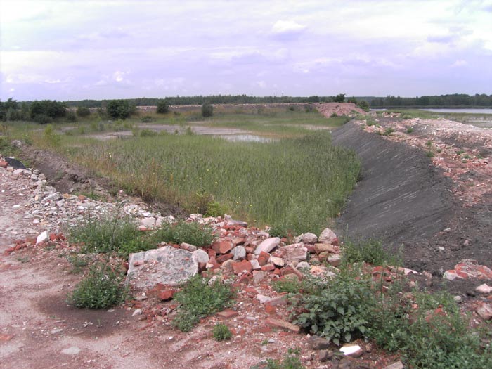 Nach der Zuschüttung. Im See selbst liegt die ganze Mumsdorfer Brikettfabrik: Stein für Stein. Billigste Entsorgung. Die vier Klärbecken - was das wohl werden soll?