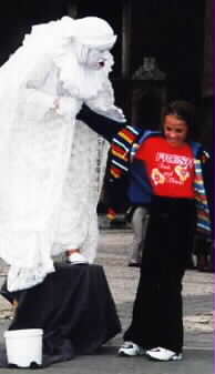 Zum Bild: Hat die Lacher auf ihrer Seite - was sie auch tut. Das Maskottchen von Krakau. Zum Straßentheaterfestival nicht im Programm - trotzdem omnipräsent. Wer einen Zloty ins Eimerchen wirft, kann sich ein Küßchen abholen - wie das Mädchen auf dem Bild. Auf Krakaus Straßen gibt es kein Tabu... |