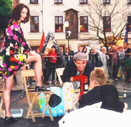 Zum Foto: Unumgängliches Requistit in Polen - selbst beim Straßentheater: Die Flasche Wodka. Und im Hinterstübchen brummelt es: "Unn mir machn doch, was wer wolln!" Aufgenommen zum Internationalen Straßentheaterfestival Krakau 2000.