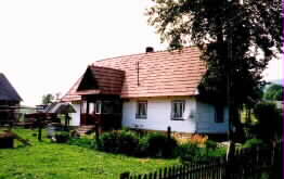 Zum Foto: Einen Kilometer vor der ukrainischen Grenze: HAUS IN MICHNIOWIEC. Mit Brunnen, Parabolspiegel, Raupe und Akelei. Bieszczaden 2000.