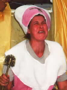 Zum Foto: Szenenapplaus vor allem der polnischen Zuschauer erhielt die Szene, als der Papst in einer Sänfte hereingetragen wurde, die sich dann als Toilette entpuppte. Aus dem Stück über die Reformation der finnischen Theatergruppe. Aufgenommen zum Internationalen Straßentheaterfestival Krakau 2000.